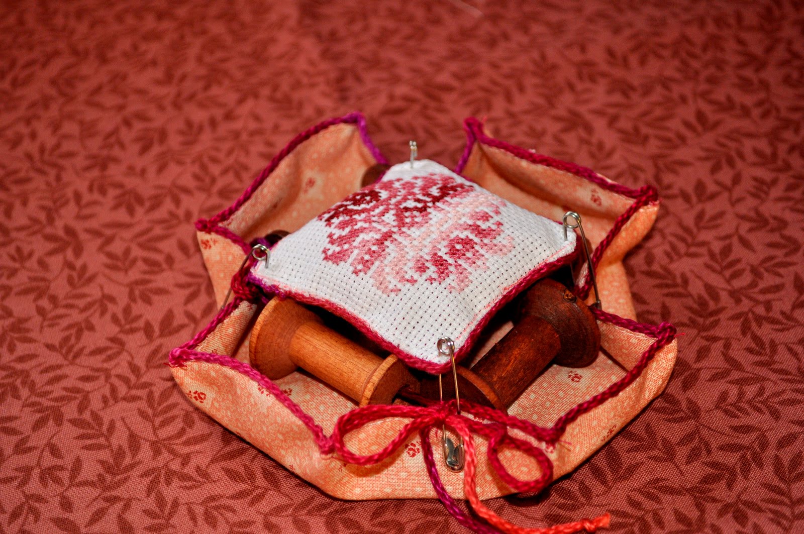 Y esto es un costurero con bobinas que hemos hecho en mi grupo de Patchwork.La realidad es que la tela es en un color rosa palo y el bordado es en un rosa degradado y aqui no se muy bien en que color es,pero ya se sabe que lo de las fotos no es lo mio.